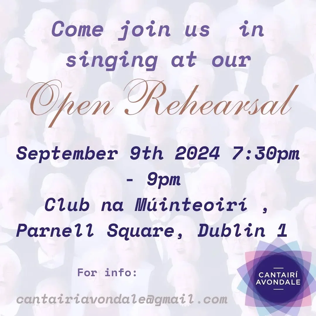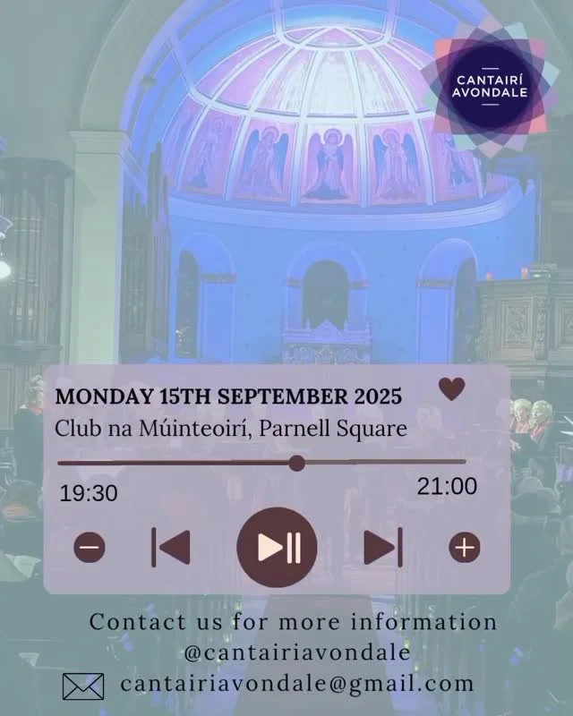 Cantairí Avondale is an accomplished SATB choir that was first established in 1970. The choir performs an eclectic mix of music, both sacred and secular, with the emphasis on a-cappella, oratorio, early music and contemporary commissions.